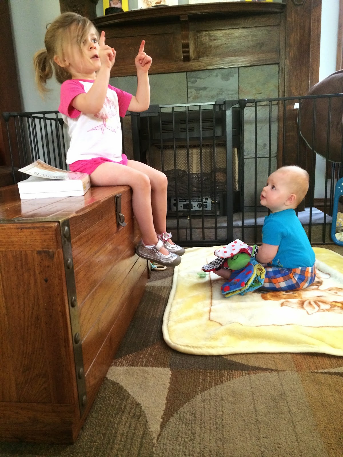 kicking, smiling, giggling, and screeching to imitate your big sister.
